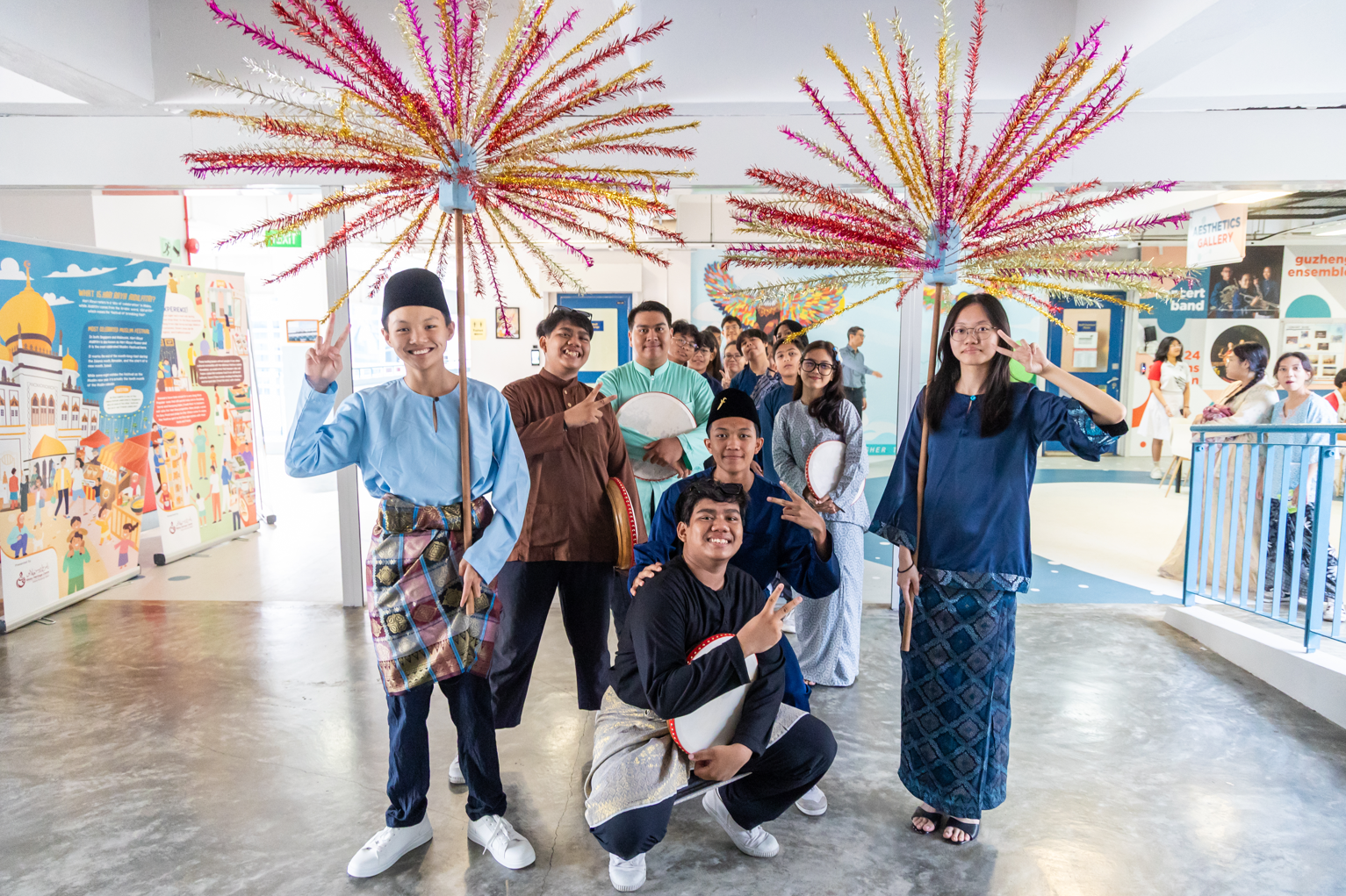 Students showcasing traditional Malay attire and instruments during Hari Raya Festival activites, celebrating cultural heritage and unity in diversity.