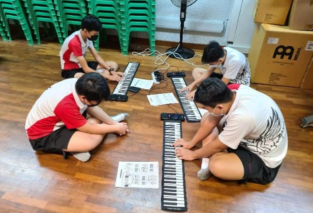 Secondary One students exploring the joy of music through learning basic ukulele chords during their Music lesson.