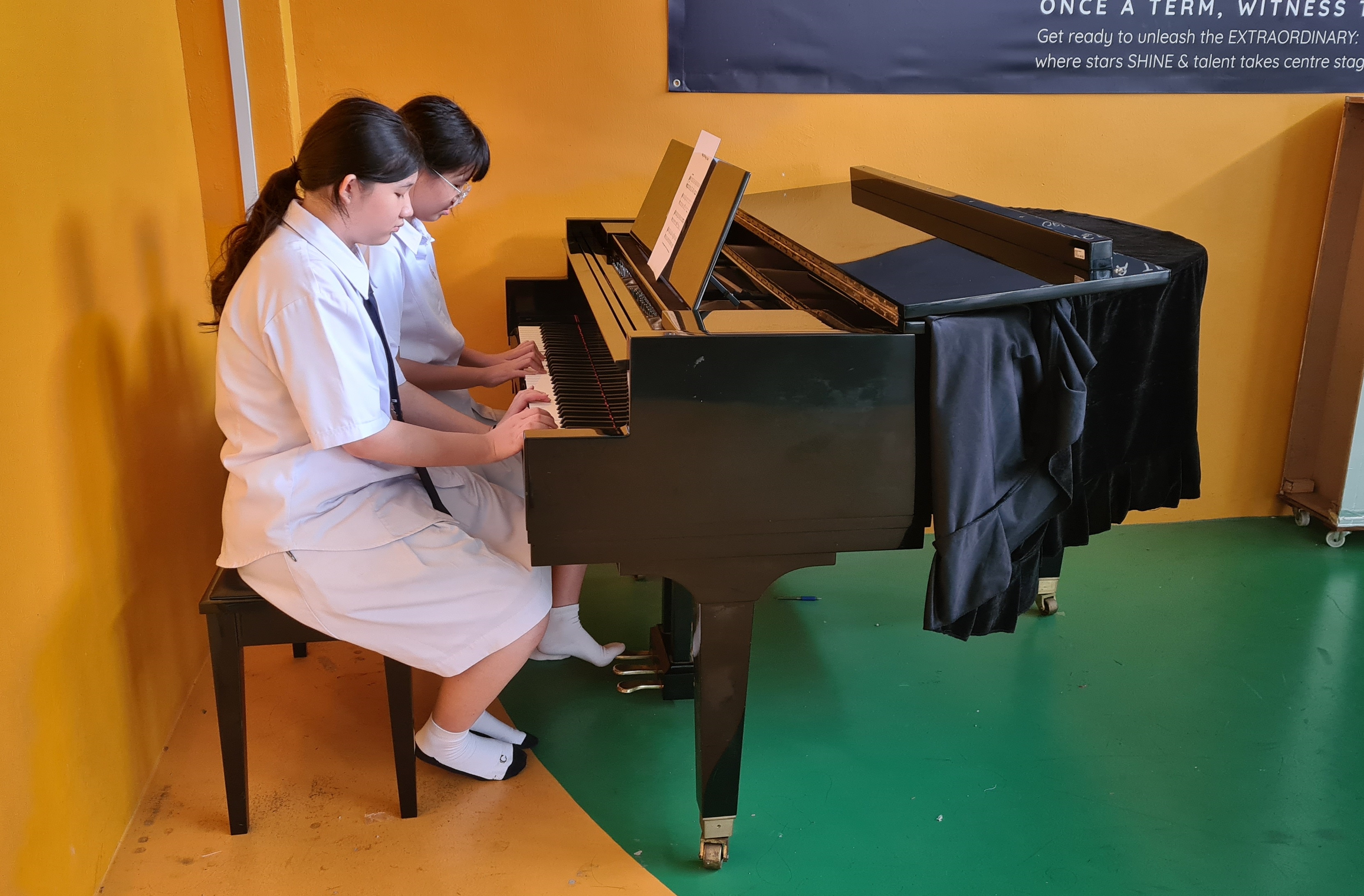 Exploring harmony and expression, Secondary Two students practicing together on the grand piano.