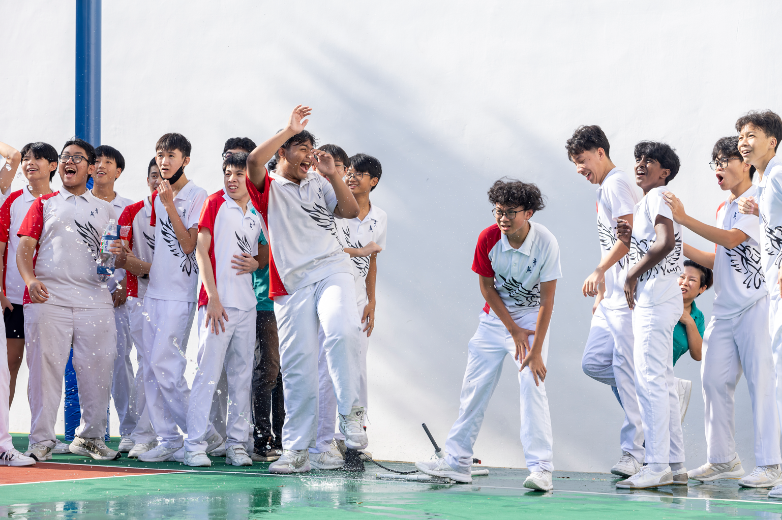Students enjoying a moment of teamwork and camaraderie during the STEM programme, learning through experimentation and shared laughter.