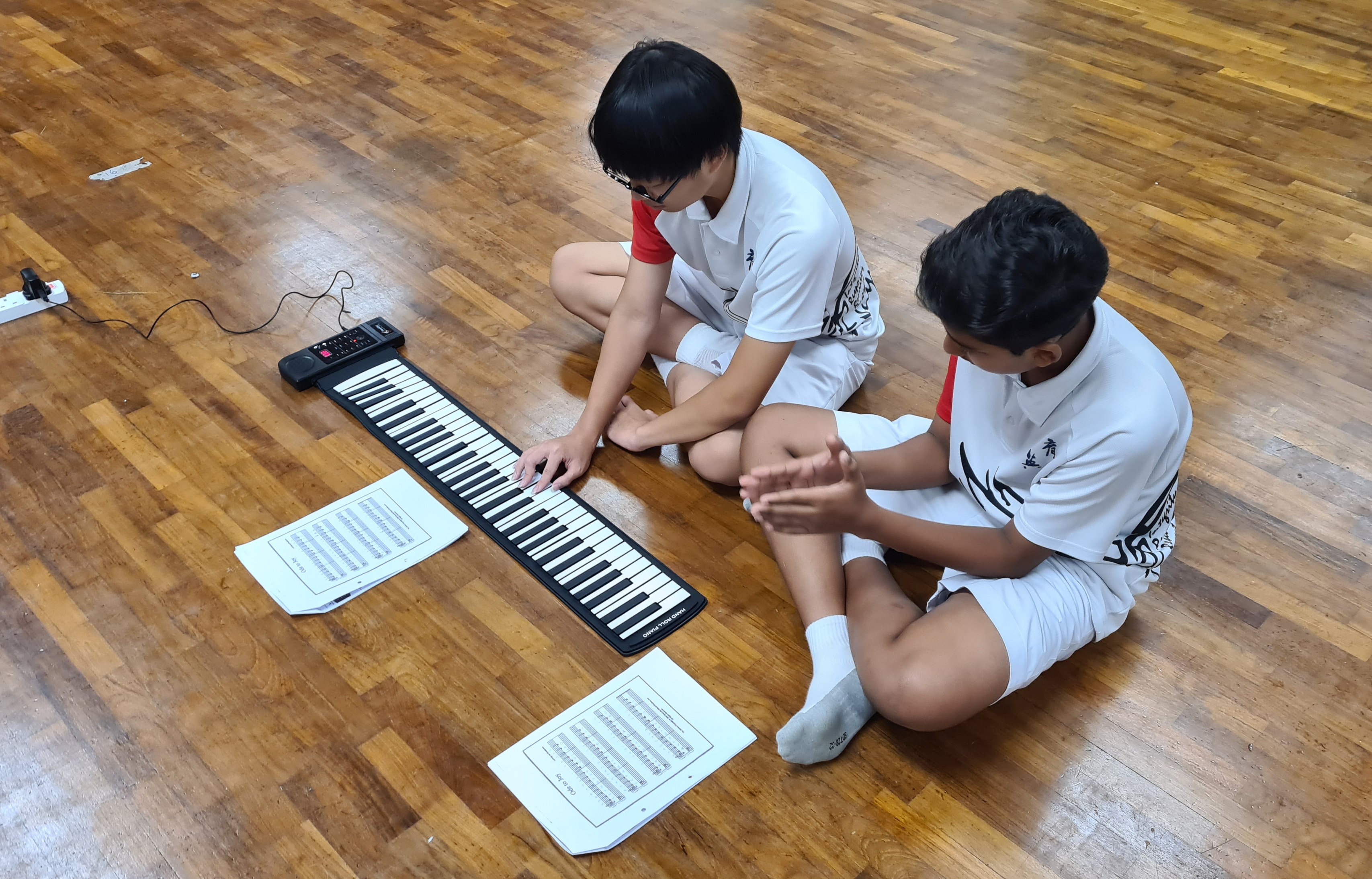 Exploring harmony and expression, Secondary Two students practicing together on the grand piano.