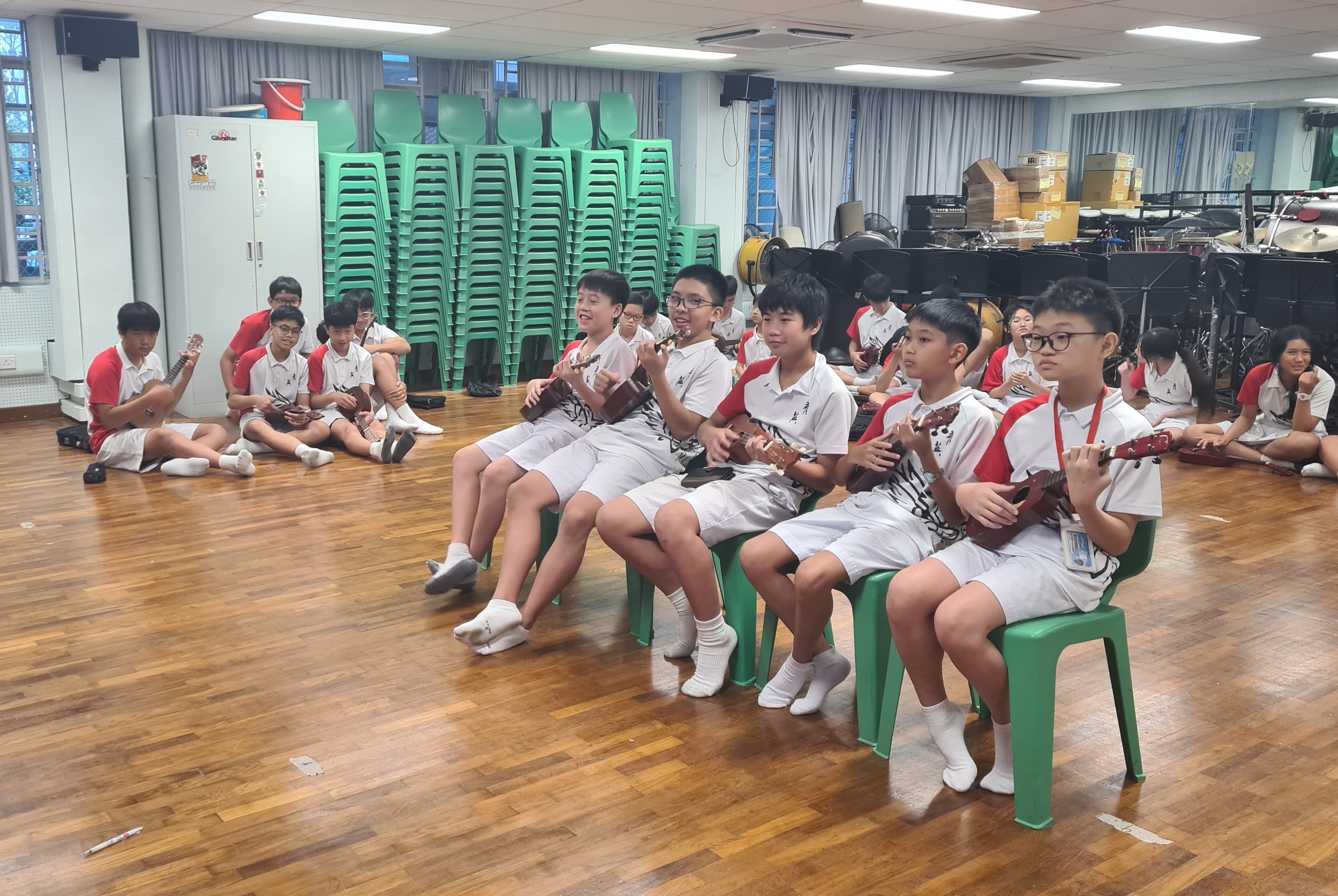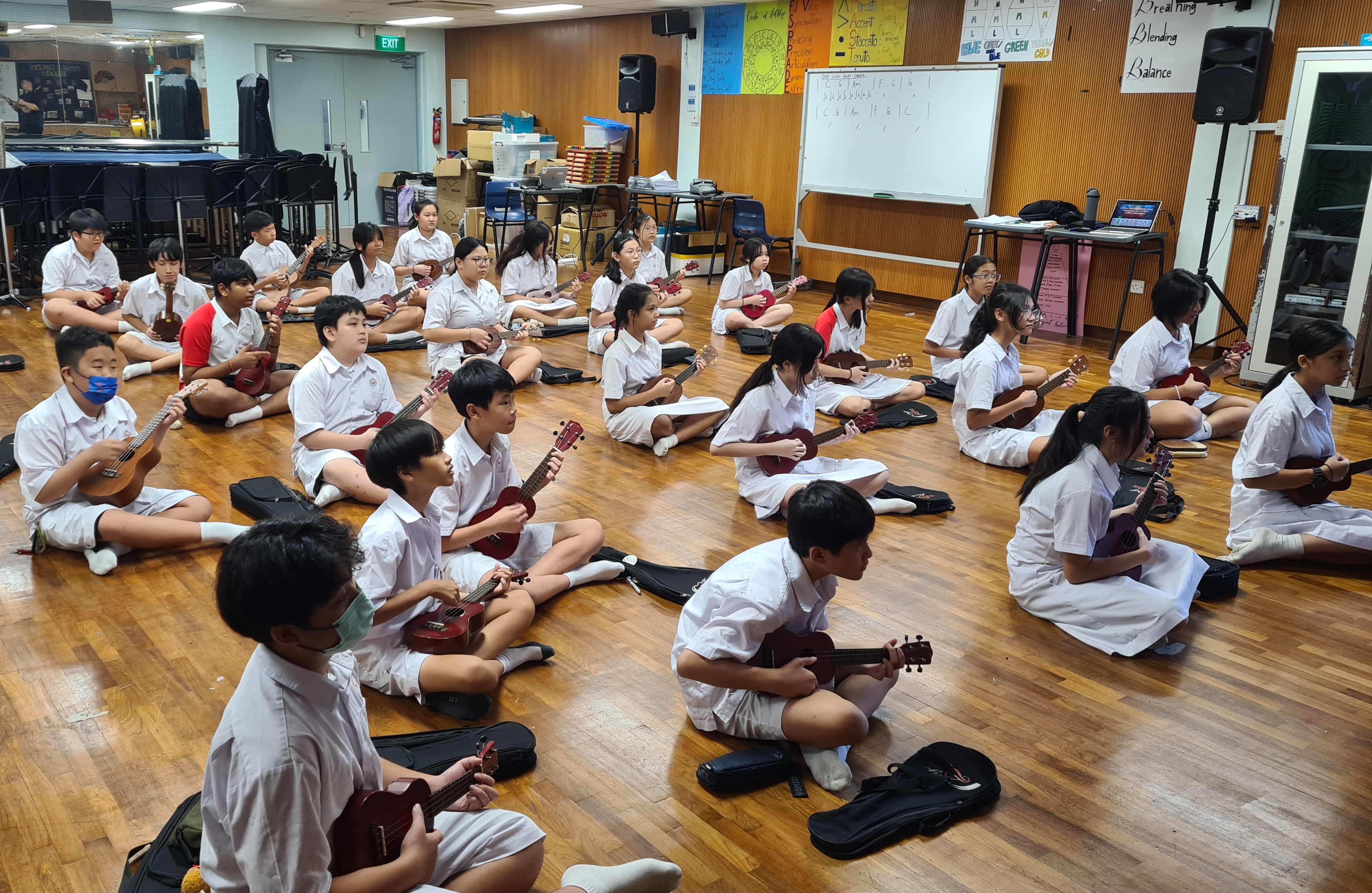 Secondary One students participating in a ukulele class performance during Music lessons.